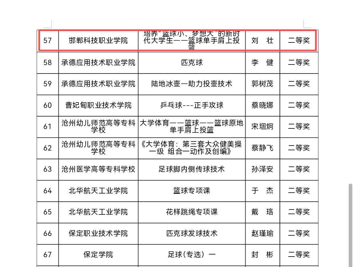 近日,河北省教育廳公布了2025年高等學(xué)校體育優(yōu)質(zhì)課評(píng)選結(jié)果。邯鄲科技職業(yè)學(xué)院體育教師在評(píng)選中表現(xiàn)優(yōu)異,榮獲一等獎(jiǎng)1項(xiàng)、二等獎(jiǎng)1項(xiàng)!祝賀他們!