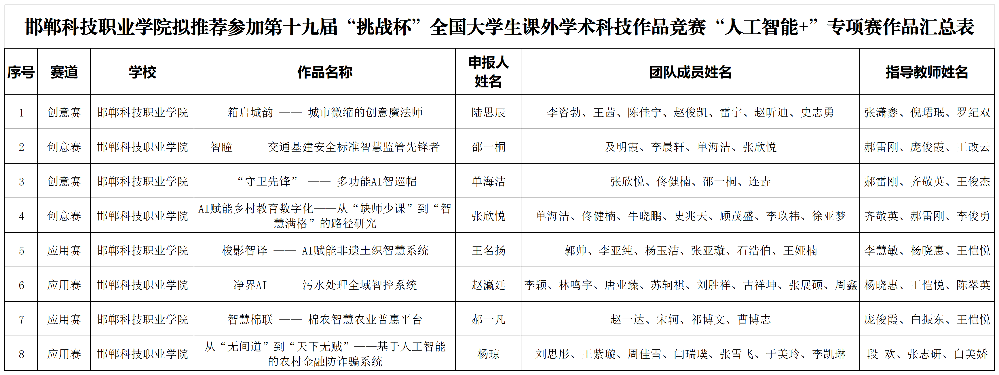 根據(jù)《關(guān)于開展第十九屆“挑戰(zhàn)杯”全國大學(xué)生課外學(xué)術(shù)科技作品競賽的工作提示》的相關(guān)要求,我院組織開展第十九屆“挑戰(zhàn)杯”全國大學(xué)生課外學(xué)術(shù)科技作品競賽“人工智能+”專項賽工作,綜合校內(nèi)外專家評審意見,現(xiàn)對我院擬推報項目的相關(guān)信息進(jìn)行公示,接受全院師生的監(jiān)督。