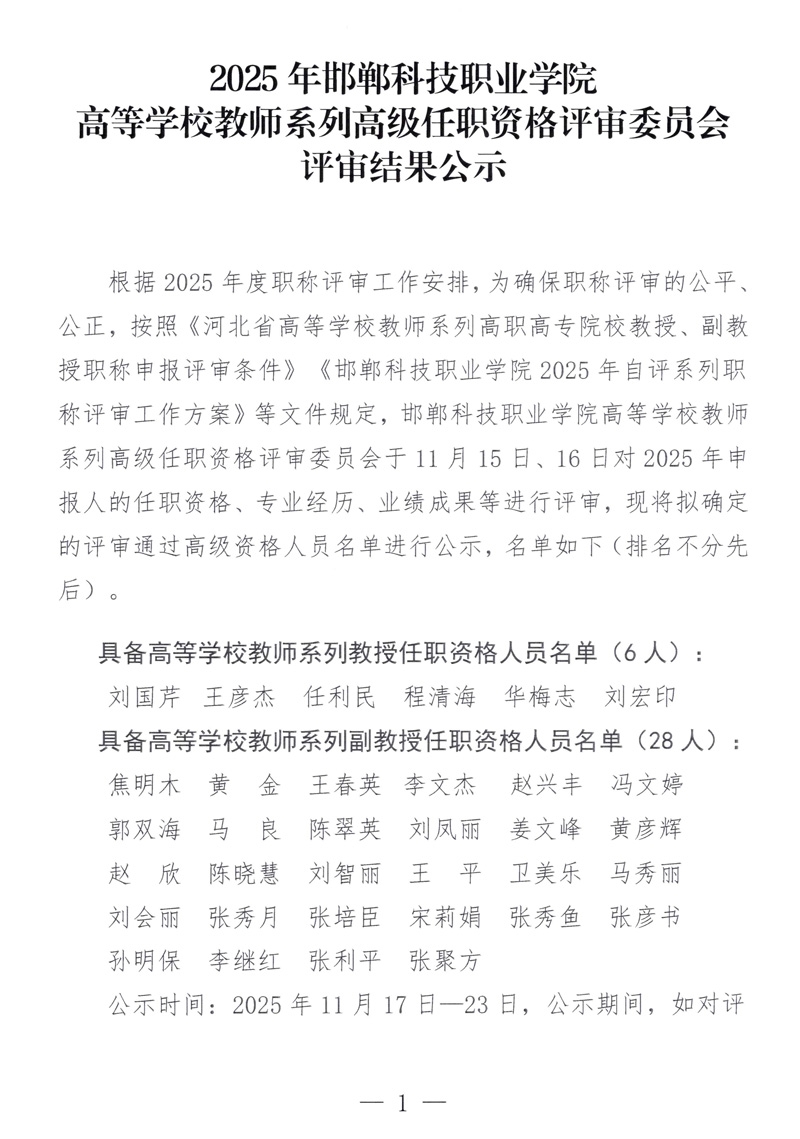 2025年邯鄲科技職業(yè)學(xué)院高等學(xué)校教師系列高級(jí)任職資格評(píng)審委員會(huì)評(píng)審結(jié)果公示