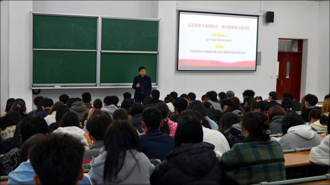 任利民以《十九屆六中全會》為主題,結(jié)合中華民族偉大復興的戰(zhàn)略全局,為學生詳細梳理了中國共產(chǎn)黨百年奮斗的輝煌歷史,傳達了十九屆六中全會的偉大精神。同時,結(jié)合世界百年未有之大變局,分析了俄烏戰(zhàn)爭背景下中國應有的戰(zhàn)略定力。