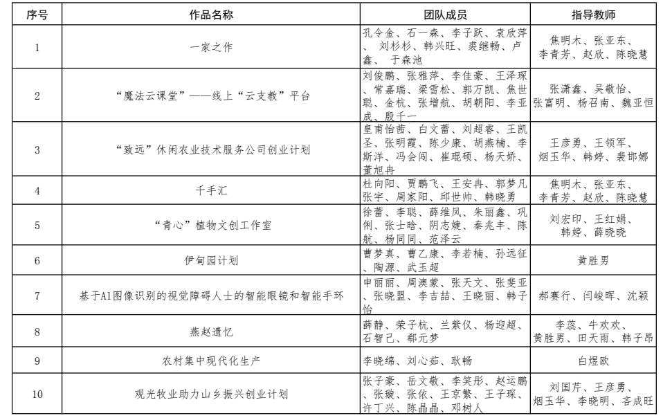 按照《關(guān)于舉辦 2022 年“挑戰(zhàn)杯”河北省大學(xué)生創(chuàng)業(yè)計劃競賽的通知》(冀團聯(lián)字〔2022〕10 號)要求,根據(jù)競賽章程,職業(yè)院校每校項目總數(shù)不超過 10 件。截止5月21日我院共收到12項作品參賽,經(jīng)過專家評審,選出10項作品推報參加2022年“挑戰(zhàn)杯”省內(nèi)競賽,作品名單如下: