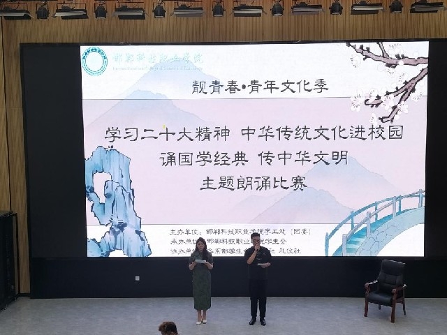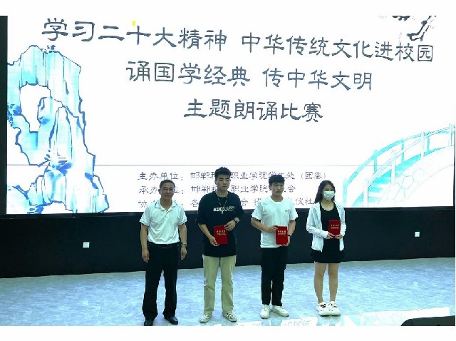 今年是全面貫徹落實(shí)黨的二十大精神的開(kāi)局之年,為深入學(xué)習(xí)貫徹習(xí)近平總書(shū)記關(guān)于弘揚(yáng)中華民族優(yōu)秀傳統(tǒng)文化的講話精神,認(rèn)真吸取中華傳統(tǒng)文化的思想精華和道德精髓,提高我校學(xué)生的文化素養(yǎng)與道德素質(zhì),6月7日下午,邯鄲科技職業(yè)學(xué)院“靚青春·青年文化季 學(xué)習(xí)二十大精神 傳統(tǒng)文化伴我行,誦詩(shī)文經(jīng)典,傳中華美德”主題朗誦比賽在國(guó)際交流中心一樓多媒體報(bào)告廳舉行,學(xué)生工作處趙芳處長(zhǎng)出席活動(dòng)。