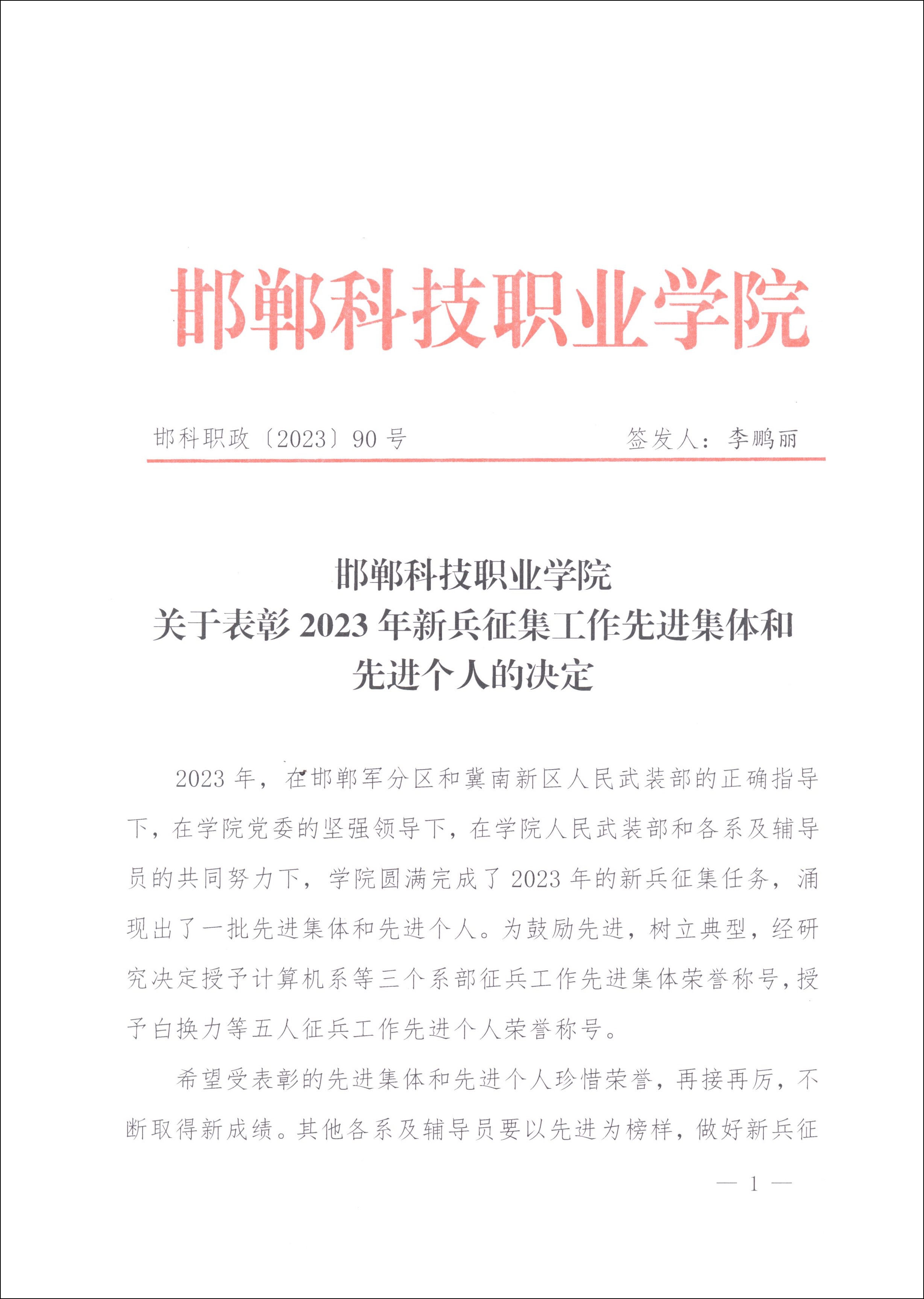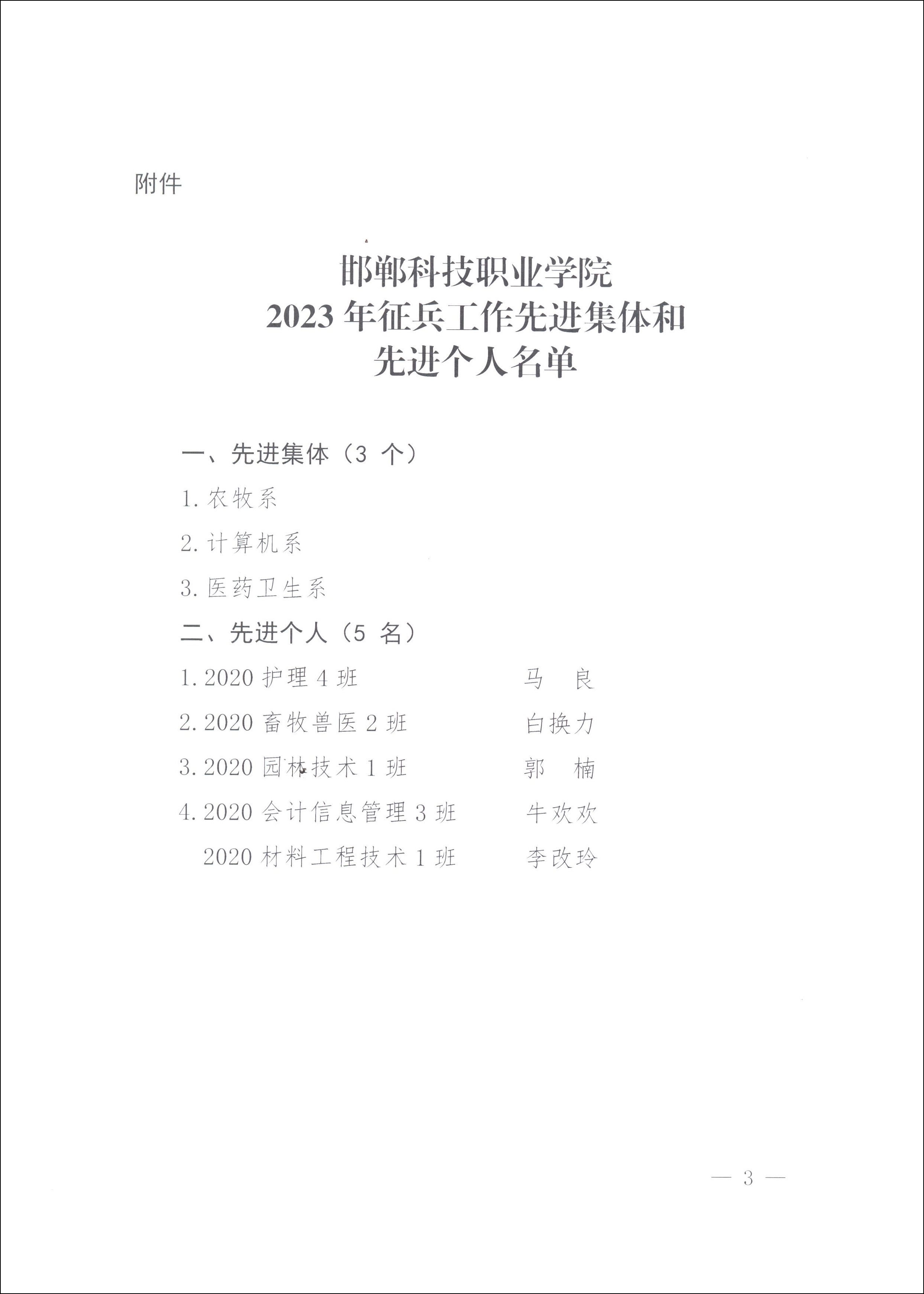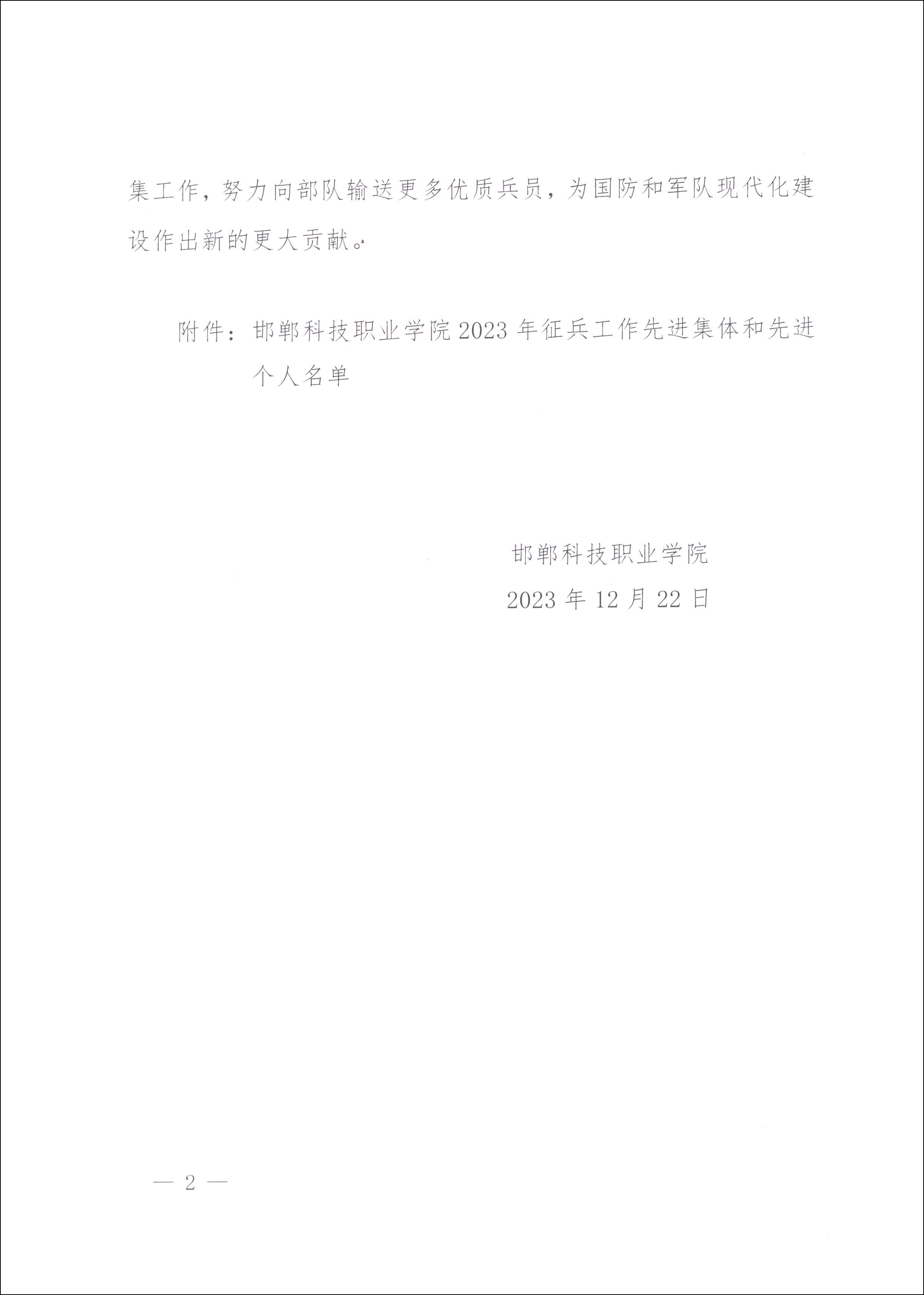 學(xué)院武裝部部長趙芳同志宣讀了2023年征兵工作先進集體和先進個人名單,并希望受表彰的先進集體和先進個人珍惜榮譽,再接再厲,不斷取得新成績。其他各系及輔導(dǎo)員要以先進為榜樣,做好2024年新兵征集工作,努力向部隊輸送更多優(yōu)質(zhì)兵員,為國防和軍隊現(xiàn)代化建設(shè)作出新的更大貢獻。