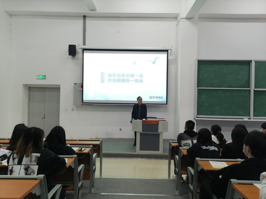 在五四青年節(jié)與建團(tuán)百年到來之際,為深入貫徹學(xué)習(xí)習(xí)近平最新講話精神,做好青年思想政治教育工作,正確引導(dǎo)大學(xué)生認(rèn)識祖國統(tǒng)一與港澳臺問題,增強(qiáng)國家認(rèn)同感、歸屬感、責(zé)任感與使命感,4月29日下午,學(xué)院黨委委員路毅、王會民圍繞“祖國統(tǒng)一”主題,分別為材料系與醫(yī)藥衛(wèi)生系的師生帶來一場精彩的形勢與政策課程。 路毅以習(xí)近平《祖國完全統(tǒng)一的歷史任務(wù)一定要實現(xiàn),也一定能夠?qū)崿F(xiàn)!》的莊重發(fā)言為開端,以時間脈絡(luò)為序,循序漸進(jìn)的從臺灣自古以來便是中國不可分割的一部分,講到兩岸通郵、通商、通航,再到新時代中臺兩地聯(lián)系緊密。通過真實案例,帶領(lǐng)學(xué)生認(rèn)清“臺獨”的本質(zhì),強(qiáng)化學(xué)生思想中兩岸“血脈相連,守望相助”的意識。最后,路毅以五四運(yùn)動為切入點,談到當(dāng)年五四運(yùn)動中青年為保衛(wèi)國家主權(quán)挺身而出,今日新時代的青年仍要以祖國統(tǒng)一為己任,從自我做起,自覺維護(hù)祖國領(lǐng)土與主權(quán)完整,激昂愛國情懷,激發(fā)奮進(jìn)意志,努力為實現(xiàn)中華民族偉大復(fù)興的中國夢團(tuán)結(jié)奮斗。 王會民圍繞“祖國必將統(tǒng)一”這一邏輯,從臺灣與大陸割裂的變遷脈絡(luò)、臺灣社會問題分析、中央的態(tài)度與立場、當(dāng)代大學(xué)生的使命擔(dān)當(dāng)四個方面,全面系統(tǒng)的解讀了“臺灣局勢有關(guān)問題”,有理有據(jù)地為學(xué)生分析了臺灣必將回歸到祖國懷抱的未來趨勢。講授中,他借助詳實事例,深度剖析、點面結(jié)合,幫助在場師生全面、客觀、準(zhǔn)確認(rèn)識到導(dǎo)致臺灣至今無法回歸的根源,并準(zhǔn)確傳達(dá)了中央對臺灣問題的立場和聲音。王會民強(qiáng)調(diào),新時代的大學(xué)生要牢固樹立“四個意識”,堅定“四個自信”,堅決做到“兩個維護(hù)”,能夠正確辨析“臺獨”的真相與實質(zhì),堅決擁護(hù)中央對臺灣問題的決定,同一切“分裂國家”的言行作斗爭,做新時代忠誠的愛國者與奮斗者,爭作祖國統(tǒng)一的守護(hù)者與發(fā)言人。 本次形勢政策課反響良好,與會師生紛紛表示將堅決捍衛(wèi)一個中國原則,堅決擁護(hù)祖國統(tǒng)一,堅決反對任何企圖分裂國家的言論和行為,自覺將安國情、強(qiáng)國志、報國行融入日常學(xué)習(xí)工作中,提高自身本領(lǐng),為祖國統(tǒng)一、民族復(fù)興貢獻(xiàn)青春力量。