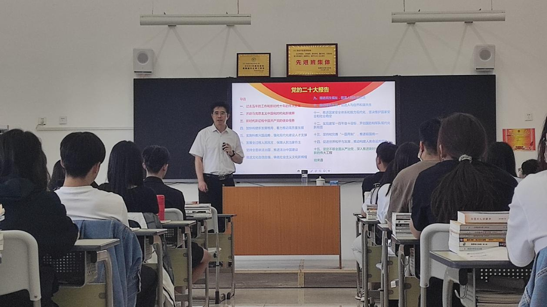 李鵬麗以《深入學習貫徹黨的二十大精神》為題,從戰(zhàn)略機遇、戰(zhàn)略任務(wù)、戰(zhàn)略階段、戰(zhàn)略要求、戰(zhàn)略環(huán)境五個方面的新的歷史特點入手,深入淺出地闡釋了二十大報告的主題與內(nèi)容,系統(tǒng)介紹了新時代新征程中國共產(chǎn)黨的使命任務(wù)。他結(jié)合學生實際,從職業(yè)教育未來發(fā)展前景出發(fā),用平實的語言引導學生秉持務(wù)實精神,先解決“找工作”難題,再思考“謀職業(yè)”“謀發(fā)展”“謀未來”,在工作崗位上發(fā)揮高素質(zhì)高水平職業(yè)青年優(yōu)勢,樹立正確的就業(yè)觀、職業(yè)觀。他勉勵學生要積極奮斗、努力拼搏,擔起時代賦予青年的歷史責任與使命,不負韶華砥礪前行。