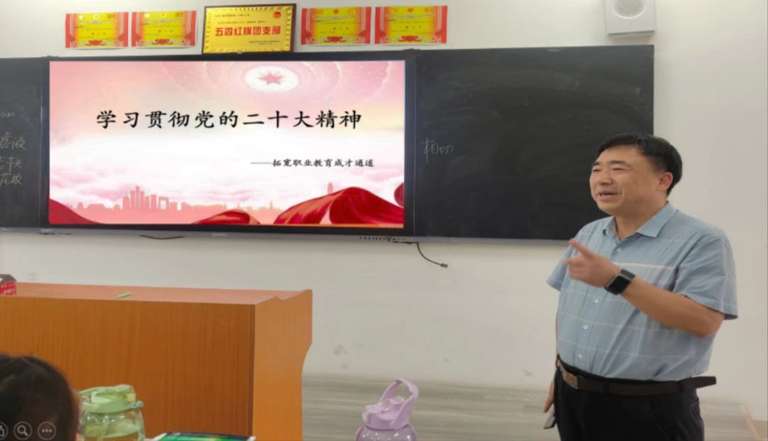路毅講授“拓展職業(yè)教育成才通道”的專題黨課,從破除對職業(yè)教育的傳統(tǒng)認知為切入點,指明職業(yè)教育已經(jīng)由之前的“謀業(yè)”“教育”“分類”轉(zhuǎn)為“人本”“產(chǎn)教”“協(xié)同”。他引導學生深刻理解提升職業(yè)學校關(guān)鍵辦學能力,加強“雙師型“教師隊伍建設(shè),建設(shè)開放性區(qū)域產(chǎn)教融合實踐中心,拓展學生成長成才通道,創(chuàng)新國際交流與合作機制。在講課中他以數(shù)據(jù)為支撐,講明職業(yè)教育專業(yè)需緊跟市場需求,不斷調(diào)整優(yōu)化,“雙師型”教師隊伍不斷擴充,產(chǎn)教融合水平不斷提升,從理論與現(xiàn)實兩個方面教育、引導學生認識職業(yè)教育、了解職業(yè)教育發(fā)展,增強自身認同感。