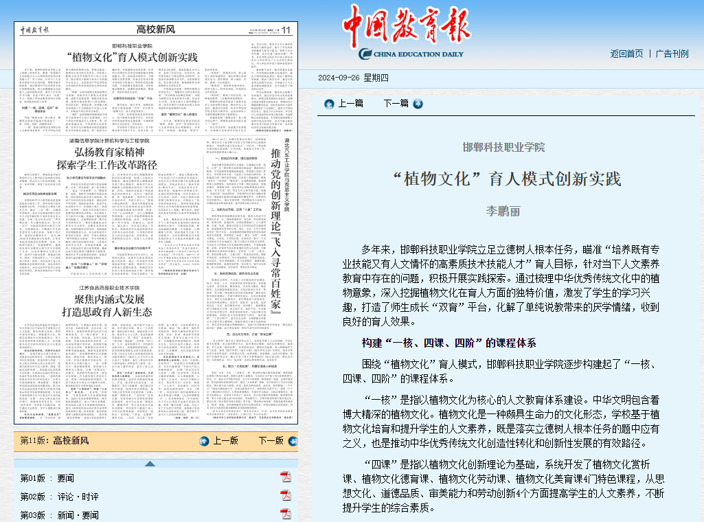 近日,《中國(guó)教育報(bào)》刊發(fā)邯鄲科技職業(yè)學(xué)院黨委副書記、院長(zhǎng)李鵬麗署名文章《“植物文化”育人模式創(chuàng)新實(shí)踐》。