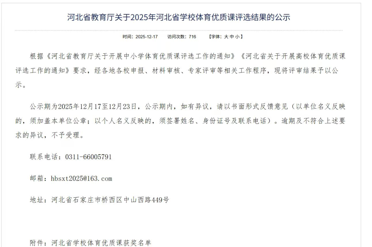 據(jù)了解,本次評(píng)選由河北省教育廳統(tǒng)一組織,旨在深入貫徹落實(shí)新時(shí)代學(xué)校體育工作要求,強(qiáng)化立德樹人根本任務(wù),推動(dòng)體育課程改革創(chuàng)新,全面提升高校體育教學(xué)質(zhì)量。評(píng)選經(jīng)過學(xué)院推薦、省級(jí)專家綜合評(píng)審等環(huán)節(jié),最終評(píng)選出一批具有示范引領(lǐng)作用的優(yōu)質(zhì)體育課程。