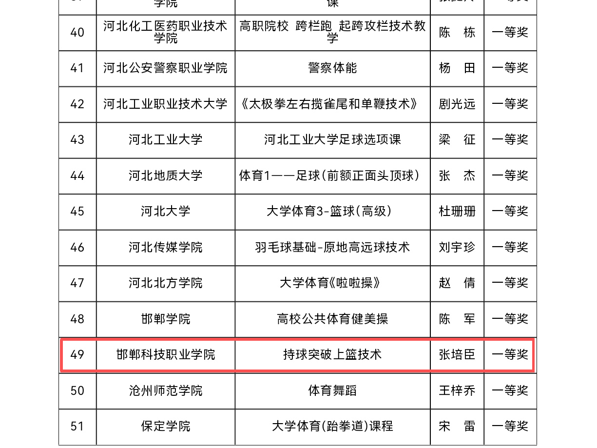 近日,河北省教育廳公布了2025年高等學(xué)校體育優(yōu)質(zhì)課評(píng)選結(jié)果。邯鄲科技職業(yè)學(xué)院體育教師在評(píng)選中表現(xiàn)優(yōu)異,榮獲一等獎(jiǎng)1項(xiàng)、二等獎(jiǎng)1項(xiàng)!祝賀他們!