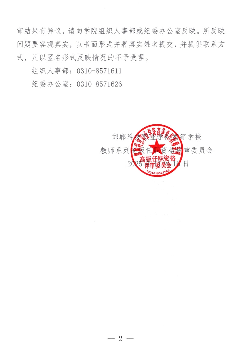 2025年邯鄲科技職業(yè)學(xué)院高等學(xué)校教師系列高級(jí)任職資格評(píng)審委員會(huì)評(píng)審結(jié)果公示