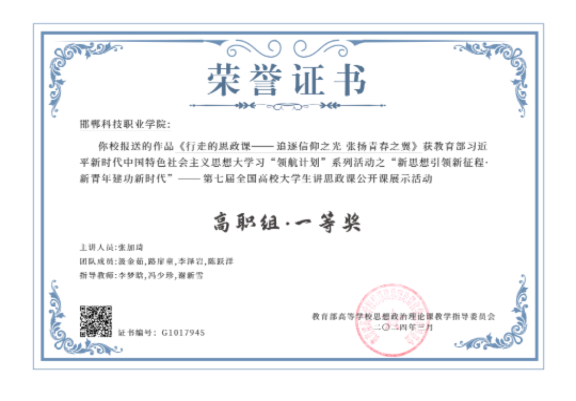 在教育教學(xué)方面。學(xué)院積極貫徹落實(shí)新時(shí)代思政課改革創(chuàng)新要求,立足國家、社會、學(xué)生自身需求,優(yōu)化思政教育教學(xué)生態(tài)。針對當(dāng)代青年特點(diǎn),結(jié)合時(shí)代發(fā)展趨勢,引進(jìn)網(wǎng)絡(luò)信息技術(shù),堅(jiān)持“以課程建設(shè)為中心、以項(xiàng)目建設(shè)為抓手、以實(shí)踐創(chuàng)新能力培養(yǎng)為特色”,推進(jìn)思政課教學(xué)改革,不斷增強(qiáng)思政課的思想性、理論性和親和力、針對性。努力打造一點(diǎn)(核心競爭能力)、兩線(線上+線下)、三面(課堂、校園、社會)、四育(思政育人、課程育人、文化育人、活動(dòng)育人)的全方位思政教育系統(tǒng),提升培根鑄魂育人效果。共建共育“大思政”平臺,創(chuàng)造性采用“雙師教學(xué)”模式,探索出“紀(jì)念碑下的思政課”“場館里的思政課”“行走的思政課”。教師指導(dǎo)學(xué)生獲教育部領(lǐng)航計(jì)劃一等獎(jiǎng)1項(xiàng)、三等獎(jiǎng)1項(xiàng)、優(yōu)秀獎(jiǎng)1項(xiàng);獲河北省領(lǐng)航計(jì)劃二等獎(jiǎng)1項(xiàng)、三等獎(jiǎng)1項(xiàng),指導(dǎo)學(xué)生獲河北省“挑戰(zhàn)杯”二等獎(jiǎng)2項(xiàng)、三等獎(jiǎng)1項(xiàng);指導(dǎo)學(xué)生獲邯鄲市創(chuàng)新創(chuàng)業(yè)大賽一等獎(jiǎng)18項(xiàng)、二等獎(jiǎng)36項(xiàng)、三等獎(jiǎng)22項(xiàng)等。