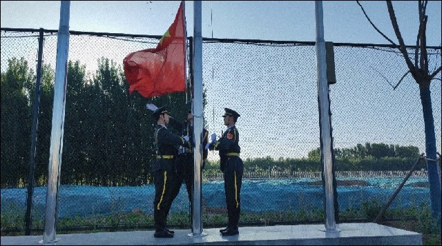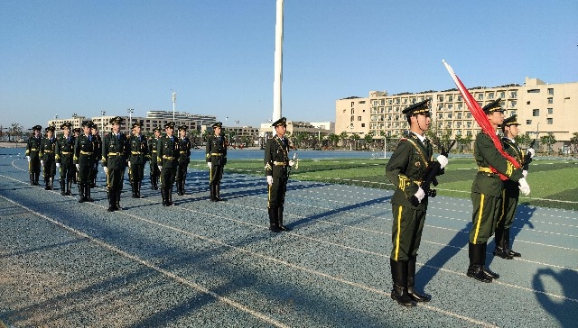 在清晨的霞光中, 伴隨著《義勇軍進行曲》慷慨激昂的旋律,鮮艷的五星紅旗冉冉升起。在場全體師生面向國旗行注目禮。