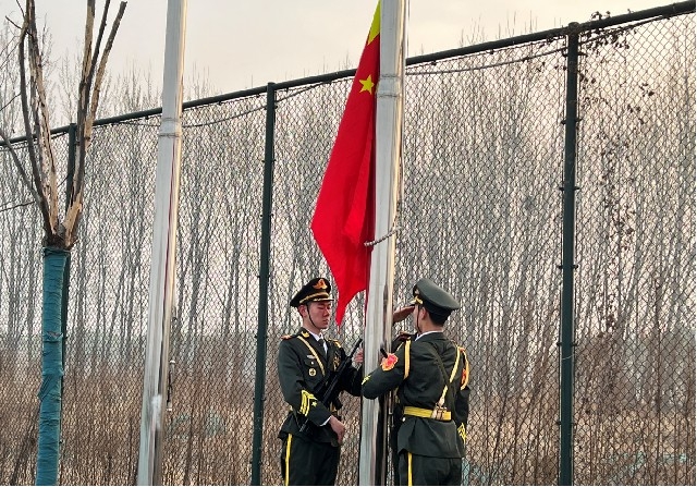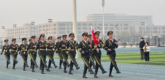 迎著朝陽,在激昂的《義勇軍進行曲》中,升旗手振臂一揮,鮮艷的五星紅旗徐徐展開,伴著激昂的國歌,五星紅旗冉冉升起。