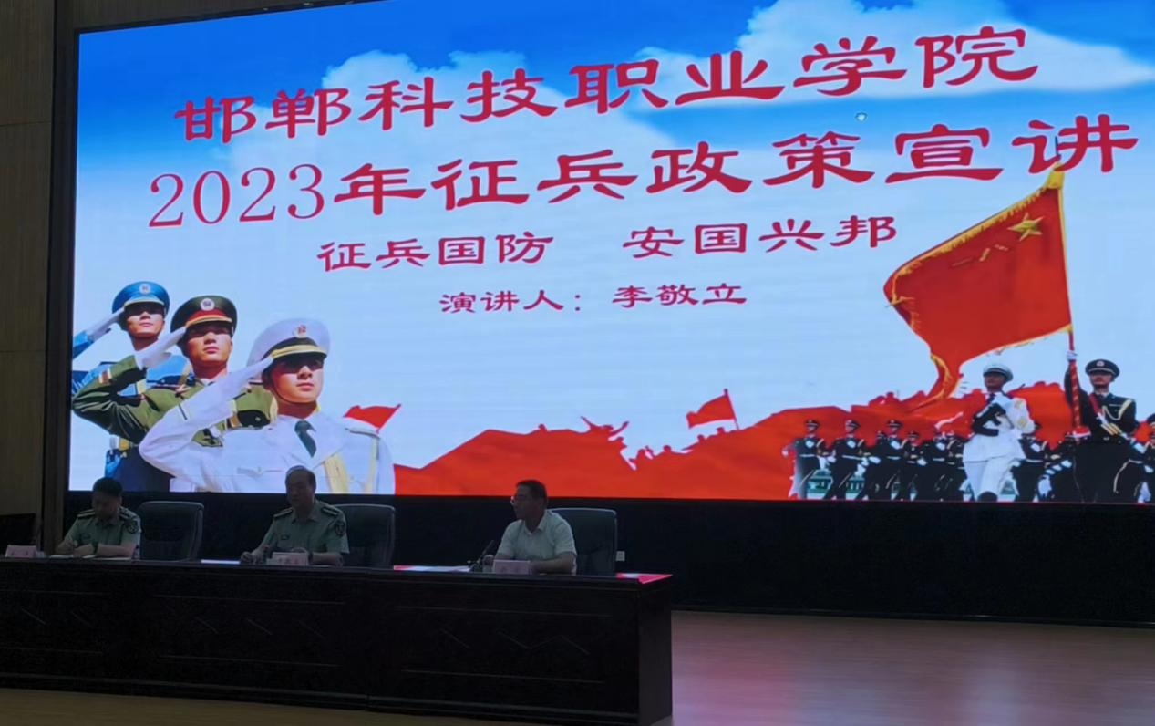 6月14日,我院在國(guó)際交流中心二樓報(bào)告廳舉行征兵宣傳動(dòng)員大會(huì),冀南新區(qū)武裝部部長(zhǎng)李敬立,軍事科姜濤、學(xué)院學(xué)工處處長(zhǎng)趙芳在主席臺(tái)就座,各系部輔導(dǎo)員,各班學(xué)生代表及國(guó)防后備營(yíng)全體人員出席大會(huì)。