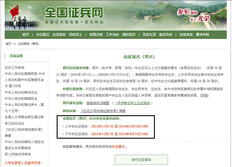 2024年應(yīng)征報名工作自2023年12月1日啟動以來,男兵就可以選報上/下半年的應(yīng)征報名啦!男兵今年下半年征兵報名截止時間是8月10日18時。建議你在7月底之前完成應(yīng)征報名,給自己留出充足的時間。